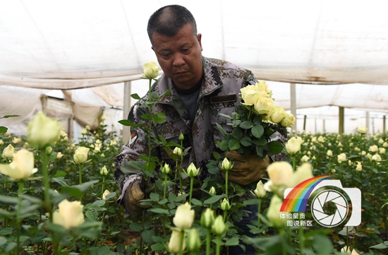 图片说明:呈贡花农杨建良在种花大棚里采摘玫瑰花,用于供应外地市场。