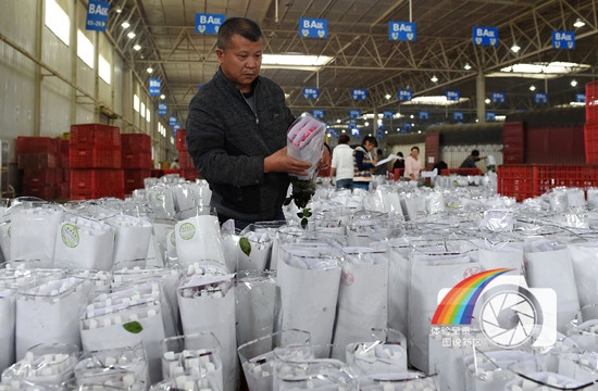 图片说明:呈贡花农杨建良在昆明斗南的国际花卉拍卖交易中心查看当日玫瑰花的品质。