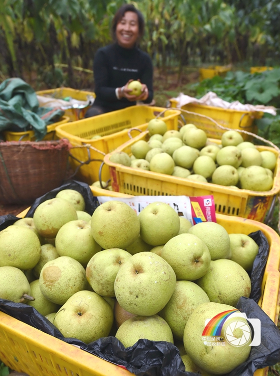 图片说明:一名呈贡农妇在万溪冲村将刚采摘的宝珠梨装筐。