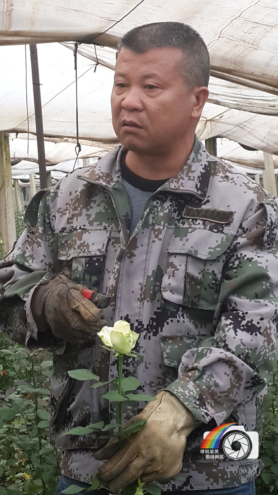 图片说明:外出租地的花农,正在向雇佣的工人讲授剪花的技巧。