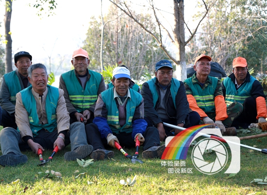 图片说明:我们平凡,但我们工人有力量,默默无闻的除草、修剪,只为把新区打造成一个干净、绿色、生态的家园。