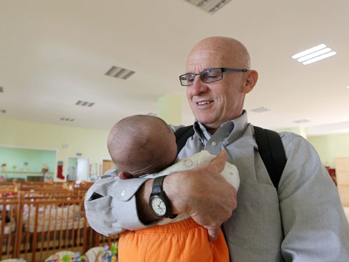初见浦哲文,他正和妻子白筠在市儿童福利院婴儿室与孩子们问候、拥抱。抱着孩子,年过6旬的浦哲文脸上满是孩童般的天真和喜悦。而当这个白皮肤、高鼻子的光头“洋爷爷”出现在“Sam”面前时,孩子的脸上也绽放着甜甜的笑容。