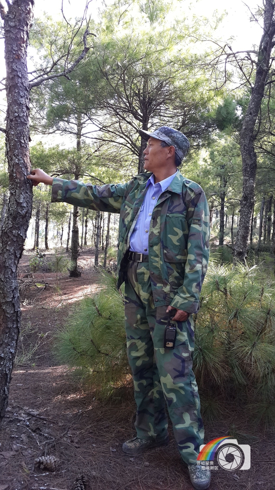 图片说明:34年守山人用自己的火眼金睛查看树上的病虫害。
