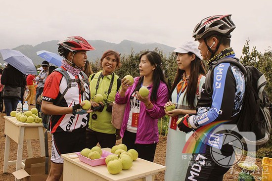 图片说明:工作人员在为游客介绍宝珠梨。