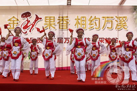 图片说明:呈贡举行万溪宝珠梨采摘节上的白族舞表演。