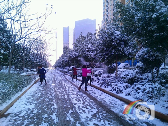 图片说明:图为志愿者们正在清除积雪,为树木减压。
