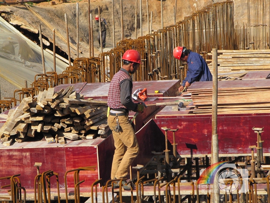 图片说明:图为建筑工人在烈日下,认真开展工作。