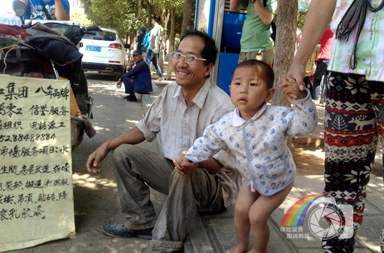 图片说明:图为呈贡街边偶遇务工人员一家子,虽然经历风雨沧桑,但不变的依旧是笑容。
