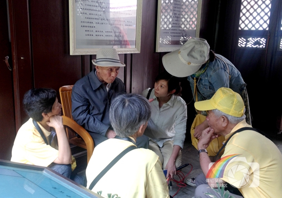 图片说明:听爷爷讲那过去的事情!图为烈士张天虚的后人,正在为市民讲述张天虚的故事。
