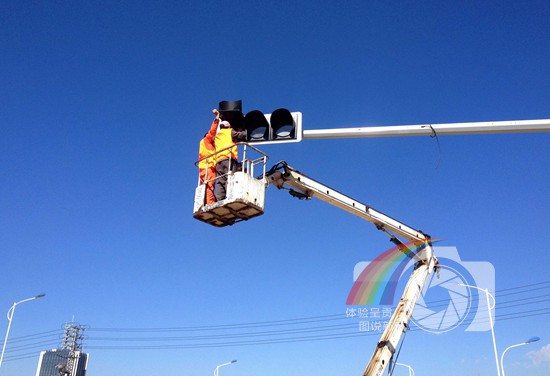 图片说明:摄于呈贡景明北路师范大学路边。图为交通设施维护工人正在高空维修交通信号灯。
