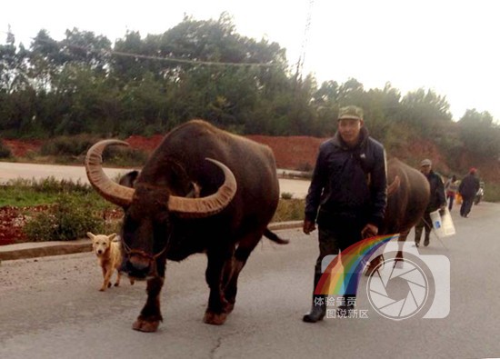 图片说明:摄于呈贡小王家营火车站附近路边。图为呈贡农民劳作结束后,正跟老牛一起回家,旁边探头的小狗让整个画面增加了归途中的温暖。