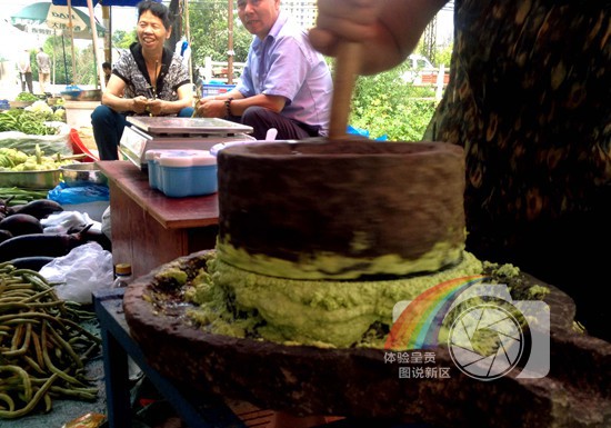 图片说明:拍摄于太平关农贸市场。图为一商贩正在用传统的石磨碾碎毛豆。碾碎了的毛豆汁经过加工后,又是一道爽口的美味。
