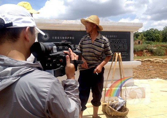 图片说明:拍摄于呈贡市级行政中心旁。图为呈贡一菜农经过乌龟碑,看到有人打听来历,便自告奋勇放下菜篮,津津有味地开始讲述历史,而摄像机也不失时机地记录下这样难得的一刻。