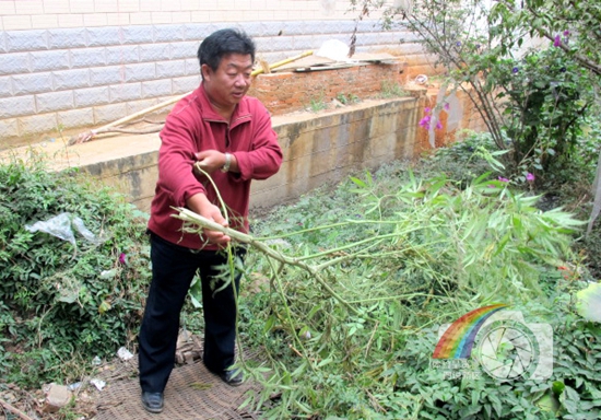 图片说明:图为社区干部亲自上阵拨除毒源大麻。