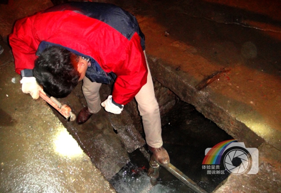 图片说明:图为古城社区干部正在检查堵塞管道,积极疏通。