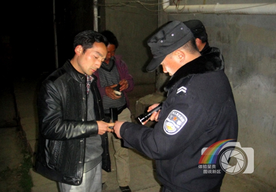 图片说明:图为古城社区联防人员正在认真检查身份证。