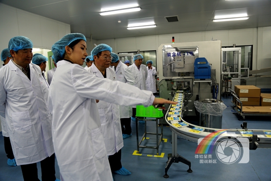 图片说明:图为云白药工作人员正为专家领导一行介绍药品制作的先进流程。