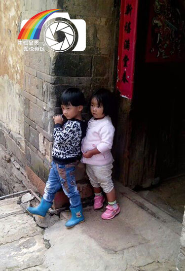 图片说明:呈贡老街老房子里,两个小孩睁大眼睛看着外来者 ,对这个世界充满了好奇,他们是未来的新区建设者。