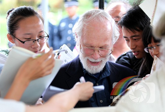 图片说明:图为云南中医学院学生们热情地请毕肖普博士(Dr John Michael Bishop,1989年诺贝尔生理学医学奖得主)签名。