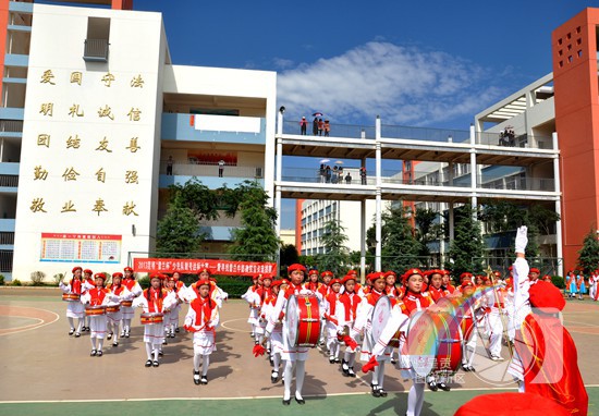 图片说明:图为龙街小学鼓号队正在排练,那股精气神,真不愧为新区小小建设者。