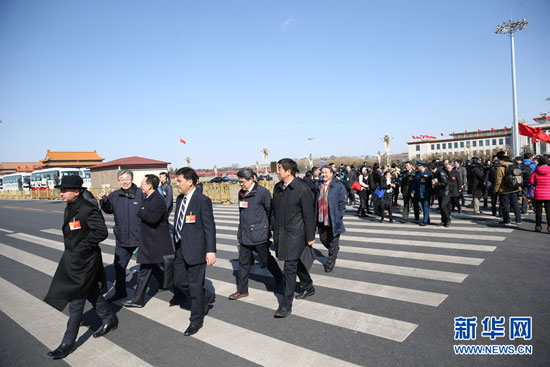 3月3日,中国人民政治协商会议第十二届全国委员会第三次会议在北京人民大会堂开幕。 这是政协委员抵达天安门广场。 新华社记者 王申 摄