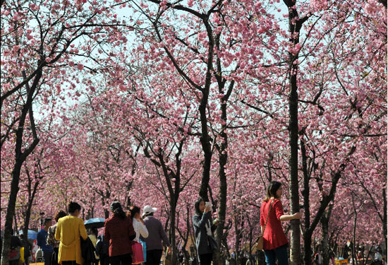 阳春三月,当第一缕春风掠过昆明,圆通公园的樱花和海棠便次第开放,千余棵花团锦簇、绚丽多姿的樱花和海棠交相辉映成一片绯红的花潮。每年此时,昆明市民到圆通公园观花的脚步最勤。有的扶老携幼漫步海棠道上,呼吸着扑面而来的淡淡花香;有的情侣牵手徜徉樱花树下,沐浴着浪漫的樱花雨。粉嫩的樱花一团团、一簇簇犹如灯笼悬挂枝头,在轻抚的微风中,它们“摇头晃脑”好似述说春天的故事;纤柔的海棠,一束束、一树树仿佛含情脉脉的“淑女”,在金色的阳光下,宛如舒展优美的身姿,为如织的游客带来舒心和宁静。昆明动物园同期举办的各种文化游园活动,让广大市民在充分享受大自然的和谐美好的同时,感受“圆通樱潮”的丰富人文内涵。