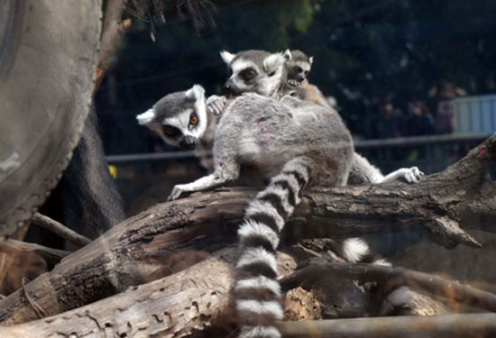 2015年2月10日,记者在昆明动物园环尾狐猴区域看到,一只狐猴蹲坐在树干中沐浴暖阳,两只幼小的狐猴紧紧贴住其肚皮,原来那是小狐猴的妈妈,只见母猴抱着小幼崽,不时舔一下幼猴的毛发,而猴爸爸也会来到母猴身边,舔舔幼猴,抱抱母猴,憨态可掬,一家子甚是温馨甜蜜。原来,为了保障狐猴宝宝们的独立生存空间,公园特别将它们以“家庭式”单位划分,“这对双胞胎狐猴为自然分娩,是公园内多年来繁育、养殖14个品种猴中第一对双胞胎,新生的母子也得到了饲养员的精心照料,食物营养进行了科学调配。”昆明动物园负责人说。