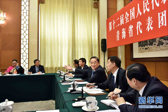 3月8日,中共中央政治局常委、全国政协主席俞正声参加十二届全国人大三次会议青海代表团的审议。 新华社 记者李涛/摄