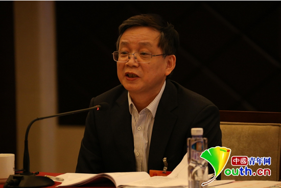 全国人大代表、国家科技部副部长侯建国在小组会上发言。记者杨茜/摄