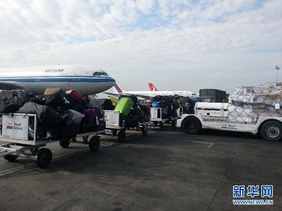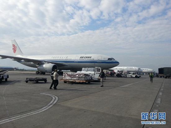 4月27日,中国政府医疗队的飞机抵达尼泊尔首都加德满都特里布万国际机场。