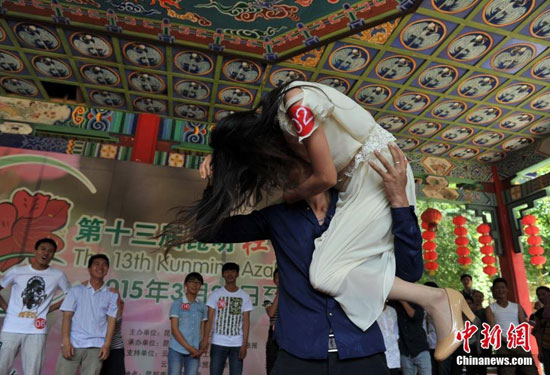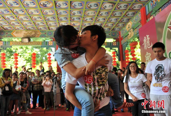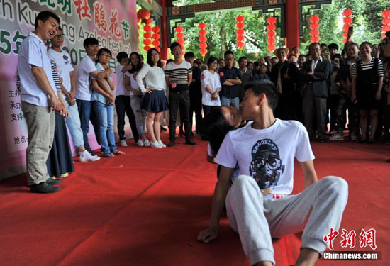 5月1日,昆明,参赛情侣们想出许多“奇葩”吻姿大秀恩爱。