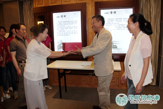 云南围棋厂厂长罗玲(左)接受市民林飞赠送的云子收藏。