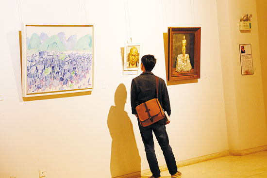 13日,在袁晓岑艺术园区,一名观众对云南美术名家邀请展的展品非常感兴趣 都市时报记者张悦/摄