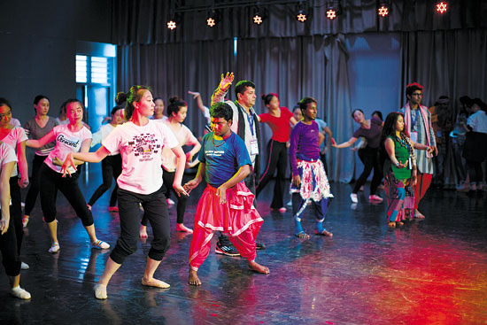 云南艺术学院学生和印度舞者一同学习傣族舞蹈的基本要领 都市时报记者孟祝斌/摄