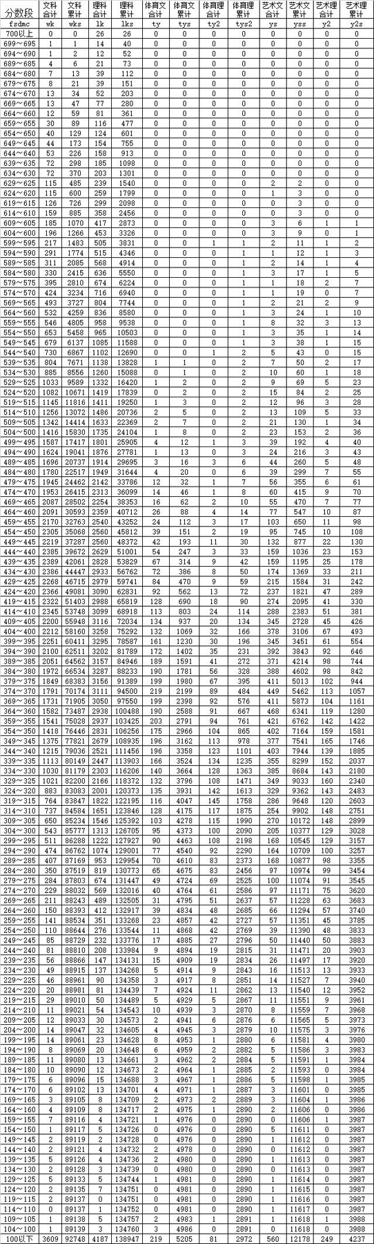 今年高考成绩上700分的“尖子生”,一共有26人,其中文科0人、理科26人。今年上600分的考生一共有4592人,其中文科1266人、理科3326人。2014年这一数据为7226人,下降明显。统计表中显示,艺术类考生中也同样有高分生,600分以上的共有10位,分数远远超过艺术类本科线(文365分,理330分),而分数最高的两位考生,更在625—629分之间。