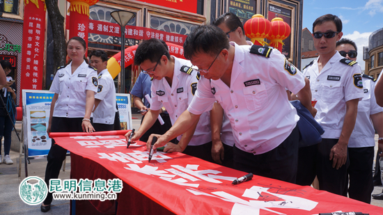 6月26日下午,在新亚洲体育城妙音KTV门前广场,一场名为 “珍爱生命、拒绝毒品、遏制艾滋、健康娱乐”的禁毒日宣传活动吸引了禁毒防艾骨干代表、学生、文化娱乐从业人员共200多人参加。参加活动的人员齐声诵读禁毒防艾口号,并观看了禁毒防艾宣传片。昆明市文化市场综合执法支队工作人员向在场的娱乐场所从业人员发出禁毒防艾自律倡议书及宣传资料,参会的人员还在印有宣传主题的横幅上签名并观看了禁毒宣传的展板。