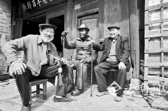 15日上午10时,青铜雕像还在运输途中,闻讯赶来的翁家贵老人已早早来到了板桥百年老茶馆,静静等待着它的到来。10多分钟后,运输车辆缓缓驶进了板桥青龙街。在当地村民的帮助下,铜像被放在了老茶馆门前。翁家贵老人仔细端详后说:“确实很像我啊!”说罢,他在铜像左侧坐下。他一边喝着茶,一边告诉围观的人们,70多年前,他驾驶汽车经过这里时,经常会到老茶馆喝茶,没想到如今103岁了,还能到这里喝茶,并且是和自己的铜像一起喝茶。跟随老人的讲述,刹那间,时间仿佛回到了70多年前那战火纷飞的年代,围观的人们纷纷拿出手机和相机,记录下这一难忘的时刻。