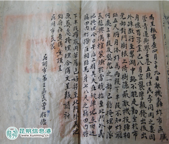 如今,抗日战争的硝烟已消散整整70周年。 为抢救保护这段历史,传承昆明的脊梁与血脉,8月14日起,昆明市档案馆将陆续对一批馆藏的珍贵历史资料进行整理和公布,以通过客观数据和真实事件的还原,进一步揭露日本军国主义犯下的罪行,呼吁人民铭记历史、勿忘国耻、珍爱和平。