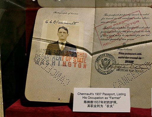 陈纳德航空军事博物馆展出陈纳德进入中国时的护照显示,上面身份为“农夫”。
