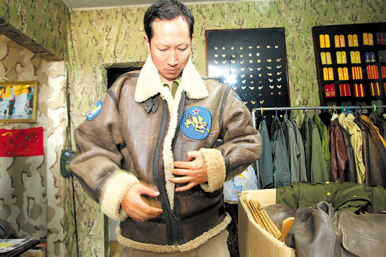 昆明民间收藏家宋向东展示他收藏的“飞虎队”飞行员皮夹克。历经数十年岁月皮质也鲜有磨损,夹克内缝有“血符”,上面写着“来华助战洋人(美国),军民一体救护”。宋向东介绍,当时航空委员会以公告的形式告诉当地百姓,假如有飞机失事,盟军飞行员遇险,请百姓看到血符后,知道他们是帮助抗战的,可以救助。至今,在云南保山、石屏等地,民众救助飞虎队员的事迹仍在流传。(昆明日报 记者姚丹苹 文 李海曦 图)