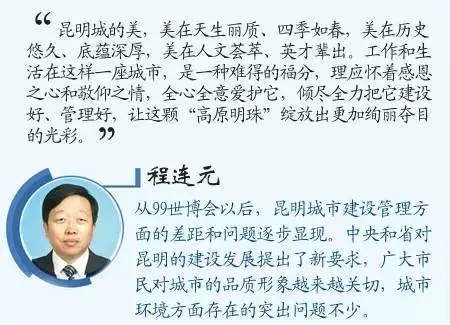 新任市委书记程连元在8月4日召开的第106次常委会议上,定调“建省会、拓格局、转思维、重民生”为昆明未来的发展思路。市容环境整治正是“建省会、拓格局、重民生”的具体体现。