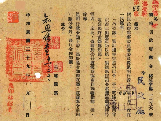 云南省政府关于滇南作战部队仍由卢汉以第一集团军总司令名义指挥,并任命卢汉为滇南作战总指挥的密令。供图