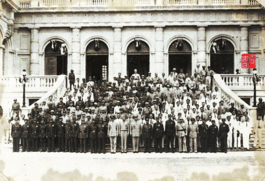 侵越日军签字投降后,中国第一方面军将领与滇南美军总部及中外人士在司令部大礼堂前合影(该司令部系前法国总督府)。供图