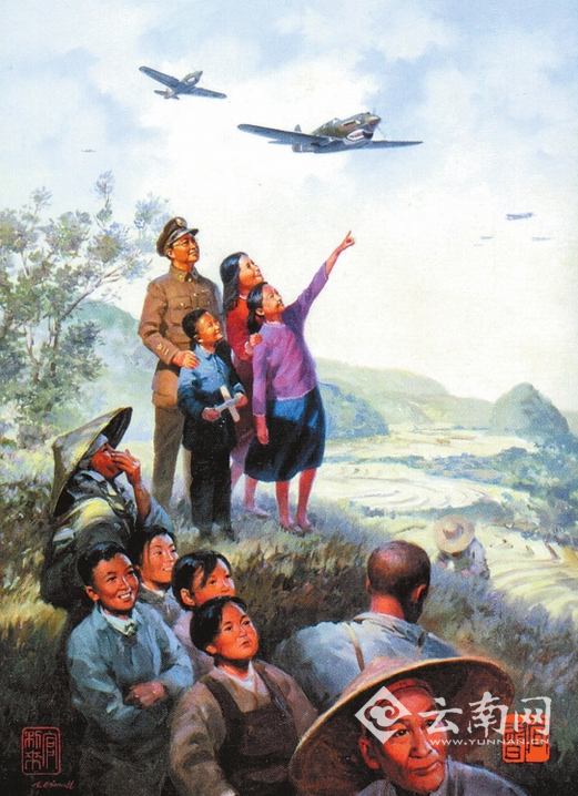 美国艺术家画的中国民众欢迎援华美军飞机油画。