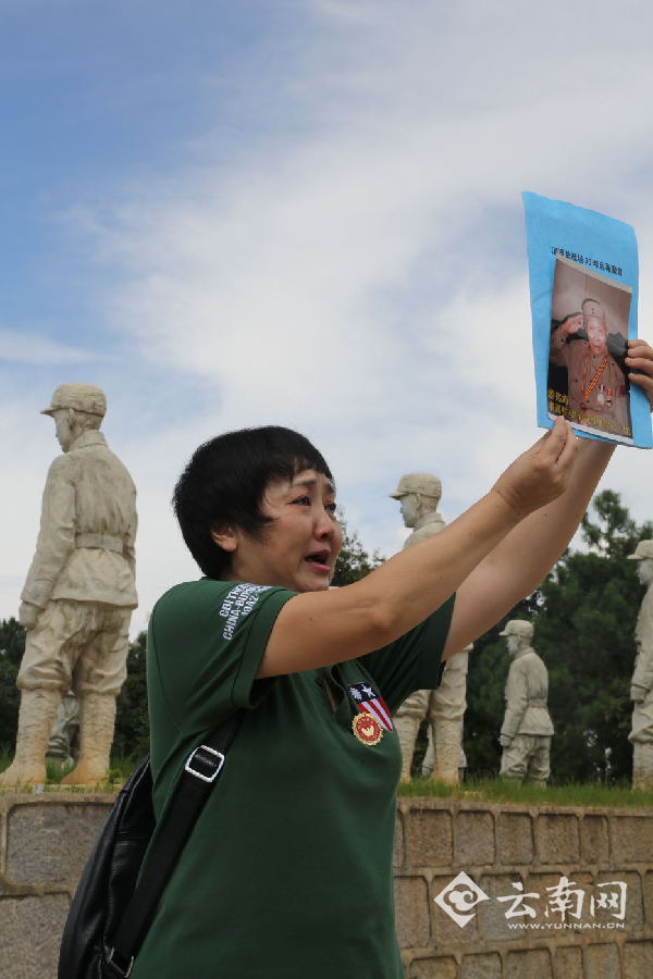 “爸爸,您在世时多么想来看看这个地方啊,今天愿望终于实现了,请您安息吧!我会记住您的教导,把健在的老兵像对父亲您一样,去关心去爱戴他们!”在中国远征军雕塑群前,四川乐山关爱老兵志愿者游小玲高高举起父亲的照片,泣不成声的请照片中的父亲看看昔日的战友。