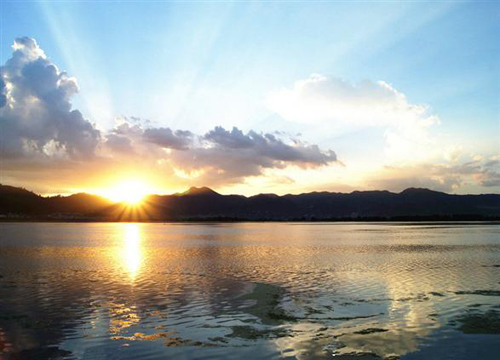 只有到海埂,您才能真切的看到睡美人山的容姿。面容清淅,曲线婀娜,秀发流转,与夕阳绘成一幅瑰丽的画卷。