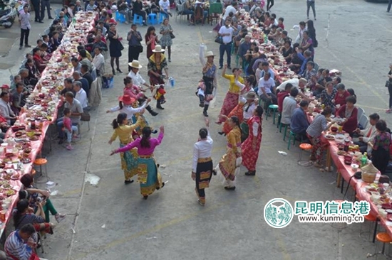9月24日下午5点,筹备已久的“百家团圆 民族和谐”的百家宴活动在环城南路山里人家宣威菜馆隆重拉开帷幕,区委宣传部、区文明办以及街道的相关领导人亲临活动现场,与辖区300余民居民同乐其中。活动由三个板块组成:一是民族大联欢座谈会。二是老年大学文艺队民族特色舞蹈表演。三是慰问活动,社区联合爱心单位和党员志愿者慰问了辖区的沙建波、杨梅、毕东红、石赵菊等20位困难少数民族。宴会上,每个家庭的一道家常菜组成了社区大家庭的这次盛宴,这是一次汉族与少数民族的餐饮、文艺联欢,也是传送温情,关爱少数民族贫弱群体的送温暖活动。