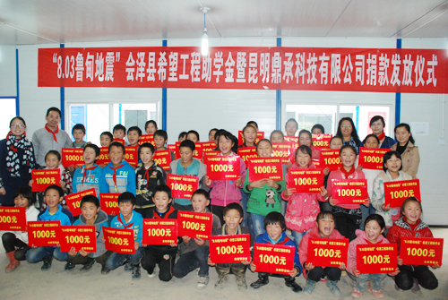 在多年的努力下鼎承公司不断发展壮大,发展的同时,鼎承人始终不忘回报社会,其中贫困学子的教育问题被放到了首位。“孩子是未来的希望,在云南我们见到许多因贫困而无法继续上学的孩子,他们对知识渴望的眼神印在了我们脑海里,我们决定将关爱下一代作为公司最重要的一项慈善工作。”公司相关负责人陈顺忠说道。在富民县散旦乡大窝塘乡和甸头村,有两所为群众所知的希望小学,一所为元亨希望小学,一所为鼎城希望小学,他们都是由鼎承科技公司捐款援建的,除了富民县,鼎承公司还将善举延伸到迪庆州、昭通市,为云南的贫困地区援建希望小学,孩子们原本漏雨透风的教室,在鼎承公司的“魔法”下,变成一栋栋整齐美丽的教学楼。校舍建成后,鼎承公司没有忘记孩子们,他们时刻关注着学生的生活和心理健康,每年的“六一”儿童节,公司都会出资购买学习用品用具、生活用品和孩子们喜欢的玩具,给学生们送去六一“惊喜”,慢慢的,这种惊喜变成了习惯和故有的期待,每当看到鼎承的工作人员出现在山头,孩子们就会蜂拥而至,把工作人员们团团围住,“哥哥你来啦!”“姐姐我好想你!”左一句又一句,让工作人员心里暖暖的。