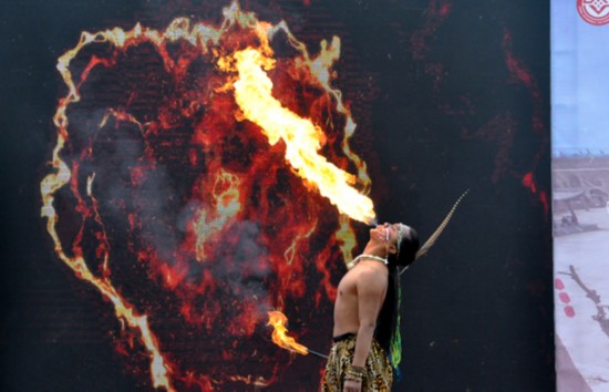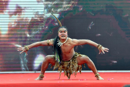 9月30日,在2015中国·银川第三届西北非物质文化遗产博览会现场,云南阿瓦野人穿着用兽皮做成的服装在舞台上踩着动感音乐秀绝活,狂野的舞蹈动作,剽悍的吼声,让你体会到什么是“上刀山、“下火海”,什么是野性,着实震撼全场。当日,2015中国·银川第三届西北非物质文化遗产博览会在镇北堡西部影视城开幕,来自宁蒙陕甘青毗邻地区24个城市的60余家具有代表性的非遗项目进行集中展示展演。