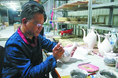 工艺师在现代克拉克瓷釉胎上手工彩绘。
